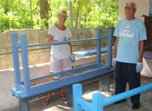 Streichen der Bänke im EDC Das EDC Anfang des neuen Jahres endlich neue Tische und Bänke für das Bildungszentrum vom Schreiner geliefert bekommen. Da diese jedoch noch aus dem Rohholz waren mussten sie dementsprechend behandelt und gestrichen werden. Dank unserer fleißigen Helfer konnten sich die Schüler bald über die neuen Sitz- und Schreibmöglichkeiten freuen. | ![]() |