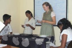 Die Mitarbeiter Das Bildungszentrum EDC wird vom Direktor Herrn Chandralal ehrenamtlich geleitet (2. Bild). Das aktuelle Lehrerteam besteht aus fünf einheimischen Lehrern - Mr. Chamil, Ms. Chatu, Mr. Buddhika Jayasignge, Ms. Udeshika und Mr. Isuru (3. Bild von links). Unterstützung bekommen sie dabei oft von internationalen Freiwilligen (Bild 4), die mit den Kindern vor allem das Sprechen in Englisch und Deutsch üben um deren Sprachbarrieren zu überwinden. |