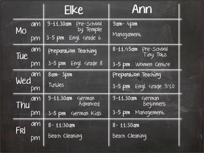 Die Arbeit als Volunteer bei uns ist sehr abwechslungsreich. Bei der Arbeitseinteilung bist du flexibel und hast viel Freiraum eigene Ideen umzusetzen. In der Regel wird Montag bis Freitag gearbeitet und die Wochenende sind frei. Du kannst in den Bereichen Teaching, Social Care, Nature Conservation, Animal Care und Management mitwirken. Manchmal gibt es auch Sonderprogramme, die ausserhalb der normalen Projekte stattfinden. Unten seht ihr eine Tafel mit der typischen Arbeitseinteilung von einer Woche, ja nachdem für welche Arbeiten sich jeder entschieden hat, sind mehrere Volunteers vor Ort, laufen die Arbeiten auch sehr oft zu zweit oder in der Gruppe ab. |